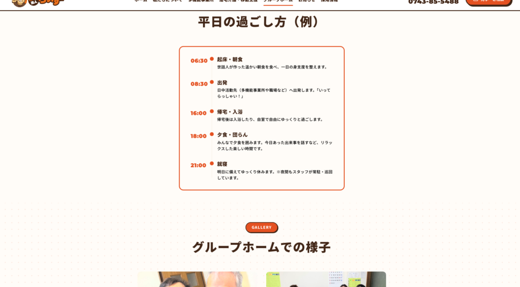 福祉施設のサイトには、利用料金や一日のスケジュールなど、細かく重要な情報が多数掲載されます。特にグループホームの料金表においては、スマートフォンでの閲覧時に文字が潰れたり表が崩れたりしないよう、従来のテーブル(表)レイアウトではなく、定義リスト(dl要素)を用いたカード型のデザインを採用しました。