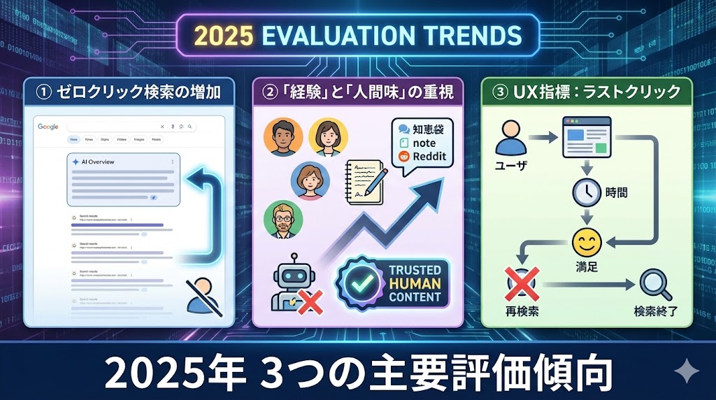 滞在時間の延長や直帰率の改善など、純粋なユーザー満足度が順位に直結する傾向が強まっています。